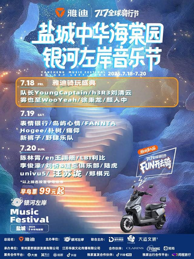 绿色出行正成为Z世代的新潮流,一场全民骑行狂欢嘉年华即将在盐城上演。7月18日至20日,雅迪将携手银河左岸音乐节,举办第九届717全球骑行节,再次把年轻人最爱的音乐节和绿色骑行完美结合,将打造行业首个“用户共创式”嘉年华!汪苏泷、陆虎、痛仰乐队、en王翊恩、LBI利比等众多人气音乐人和乐队将齐聚现场,带来精彩表演,和大家一起“FUN开去骑”,嗨翻整个夏天!