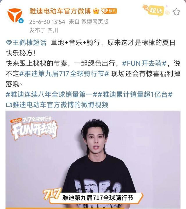 看点一:全民开骑,花样玩不停!雅迪品牌全球代言人王鹤棣为第九届717全球骑行节隔空打Call,发出“草地+音乐+骑行”的召集令!用户在抖音、微博等平台发布骑行主题内容,就有机会获得雅迪官方认证的“夏日追风合伙人”称号和惊喜福利!活动正在吸引大量用户和达人参与创作,掀起了全网骑行热潮!